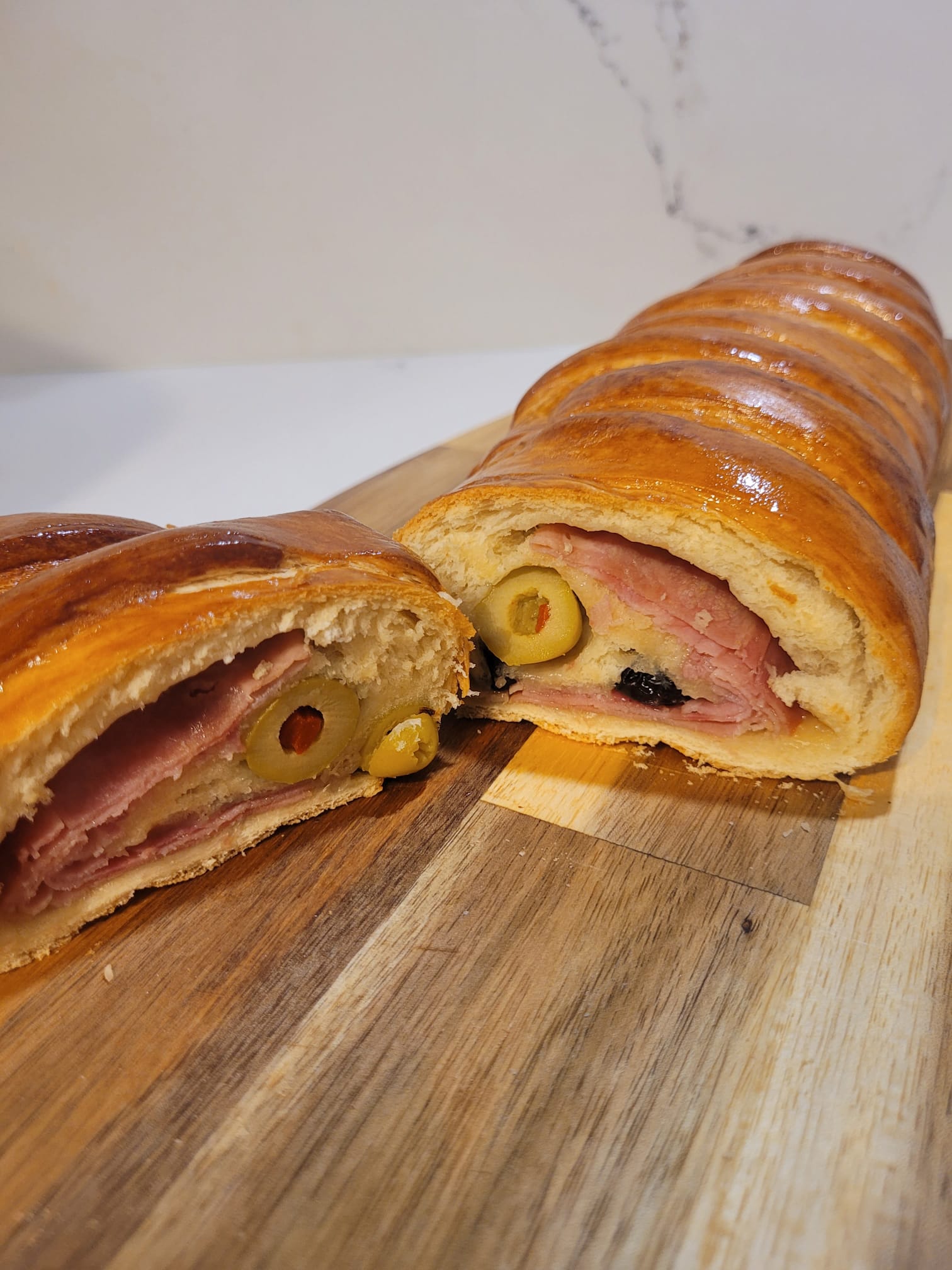 Nuestra masa suave, ligeramente dulce y horneada en su punto, envuelve un relleno generoso de jamón, tocineta crujiente, pasas jugosas, aceitunas y alcaparras, creando ese balance perfecto entre lo salado y lo dulce que lo convierte en un clásico inolvidable.